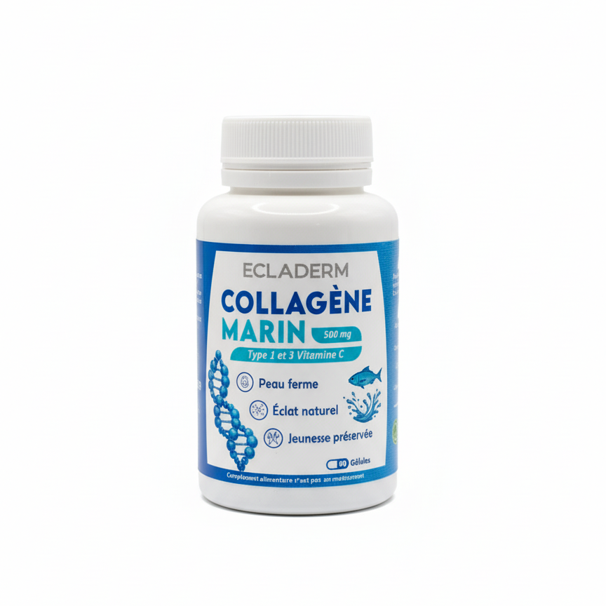 L’ECLADERM Collagène Marin 90 Gélules révolutionne la beauté de l’intérieur avec sa formule collagène marin type I et III vitamine C anti-âge. Cette innovation Ecladerm offre une triple action peau cheveux ongles grâce au collagène marin haute absorption enrichi en vitamine C pour une peau raffermie, cheveux fortifiés, ongles renforcés et jeunesse préservée de l’intérieur.